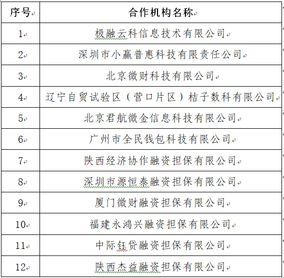 根据《金融监管总局关于加强商业银行互联网助贷业务管理提升金融服务质效的通知》(金规〔2025〕9号)第四条要求,“商业银行总行应当对平台运营机构、增信服务机构实行名单制管理,通过官方网站、移动互联网应用程序等渠道披露名单,及时对名单进行更新调整”,现将符合上述规定要求的互联网助贷合作机构公示如下: